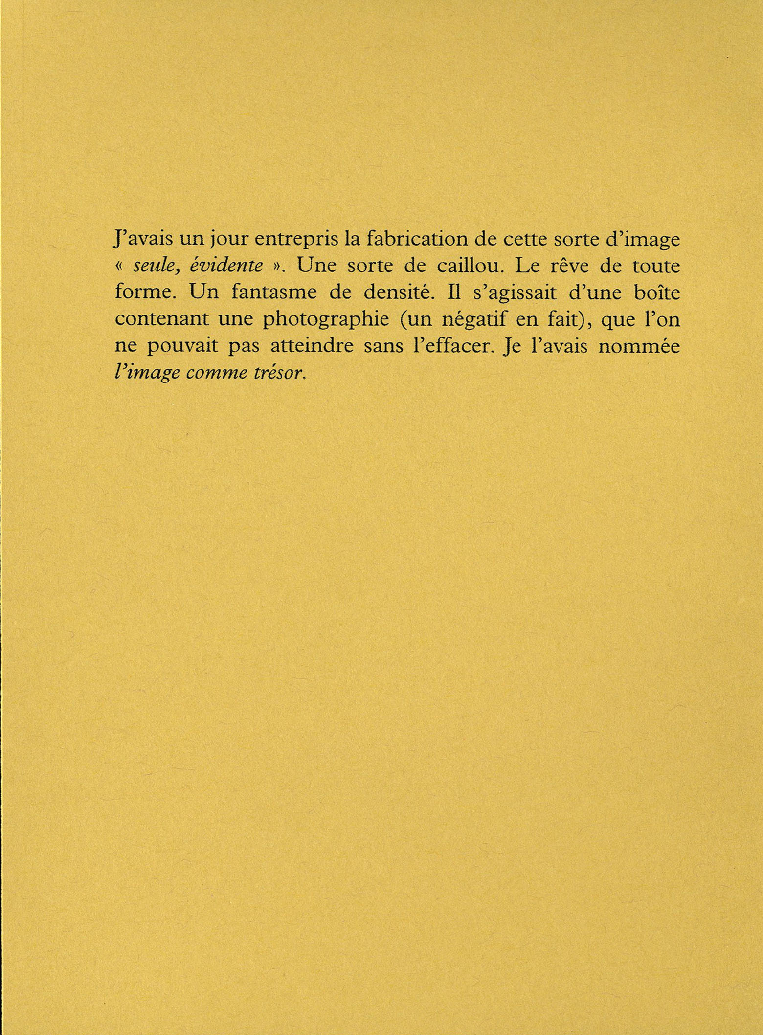 J’avais un jour entrepris la fabrication ce cette sorte d’image « seule, évidente ». Une sorte de caillou. Le rêve de toute forme. Un fantasme de densité. Il s’agissait d’une boîte contenant une photographie (un négatif en fait), que l’on pas atteindre sans l’effacer. Je l’avais nommé l’image comme trésor.