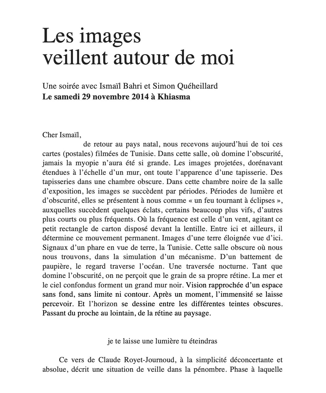 retour pays natal, nous recevons aujourd’hui toi ces “cartes postales” filmées Tunisie. Dans cette salle, domine l’obscurité, jamais myopie n’aura été grande. Les images projetées, dorénavant étendues l’échelle d’un mur, ont toute l’apparence d’une tapisserie. Des tapisseries dans une chambre obscure. Dans cette chambre noire salle d’exposition, les images succèdent par périodes. Périodes lumière d’obscurité, elles présentent nous comme «un feu tournant éclipses», auxquelles succèdent quelques éclats, certains beaucoup plus vifs, d’autres plus courts plus fréquents. fréquence est celle d’un vent, agitant petit rectangle carton disposé devant lentille. Entre ici ailleurs, détermine mouvement permanent. Images d’une terre éloignée vue d’ici. Signaux d’un phare vue terre, Tunisie. Cette salle obscure nous nous trouvons, dans simulation d’un mécanisme. D’un battement paupière, regard traverse l’océan. Une traversée nocturne. Tant que domine l’obscurité, perçoit que grain propre rétine. mer ciel confondus forment grand mur noir. Vision rapprochée d’un espace sans fond, sans limite contour. Après moment, l’immensité laisse percevoir. l’horizon dessine entre les différentes teintes obscures. Passant proche lointain, rétine paysage.