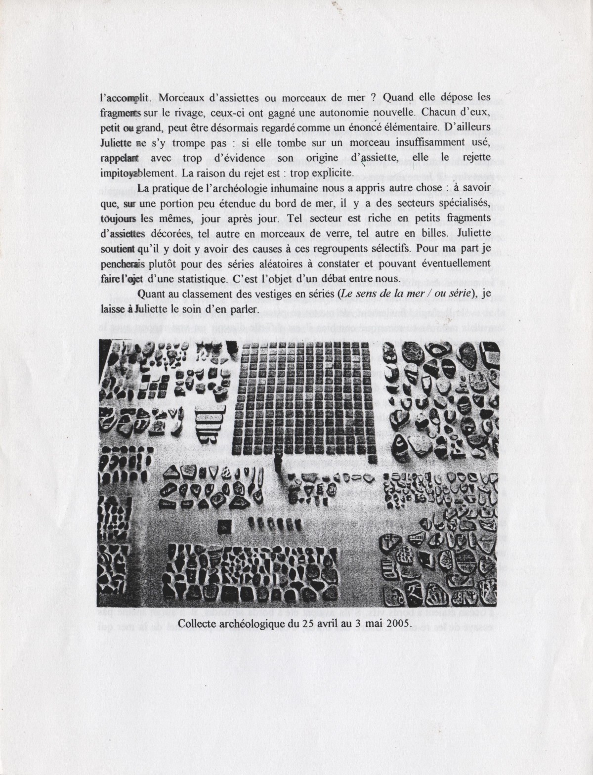 Gazette de la Villa Harris, 2005. Le texte qui suit est une lettre du poète Emmanuel Hocquard en réponse à mon oeuvre photographique « Quinze flaques sur ma table », dédicassée à l’archéologue Montalban, personnage de ses livres.