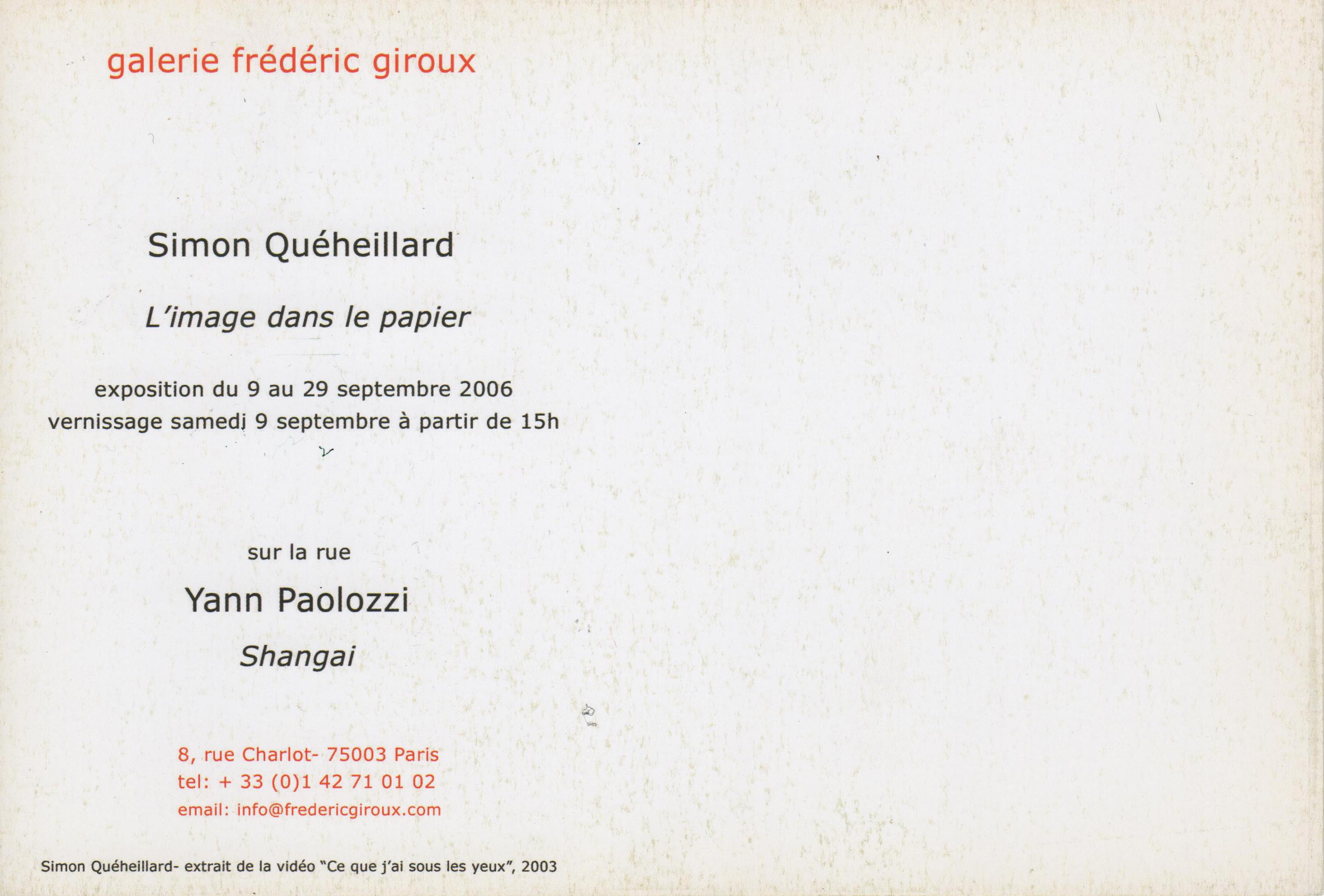 Mais vous regardez vos pieds, vous vous penchez sur ces petites flaques d’eau, vous verrez monde, bleu ciel gris des nuages qui résonne avec gris l’asphalte, vous verrez course soleil vous serez éblouis. Ces flaques sont des miroirs, des yeux ouverts sur monde. cime des arbres s’y reflète cependant que l’ombre même arbre les caresse. C’est monde insoupçonné qui soudain révèle vos yeux.C’est effet révélateur que nous voyons ici l’oeuvre, comme dans une photo qu’on développe. Simon Quéheillard erre dans Paris recherche bitume parfait, rue Villiers l’Isle-Adam, rue Chine, rue Fessart. Avec une bouteille PVC Coca d’un rouge bien vulgaire, verse l’eau sol, crée une flaque révèle monde. Parfois l’eau s’écoule, flaque s’assèche, l’image meurt. Parfois ses flaques épousent paysage, une flaque longue va, une fois les ridules apaisées, montrer clocher l’église voisine.