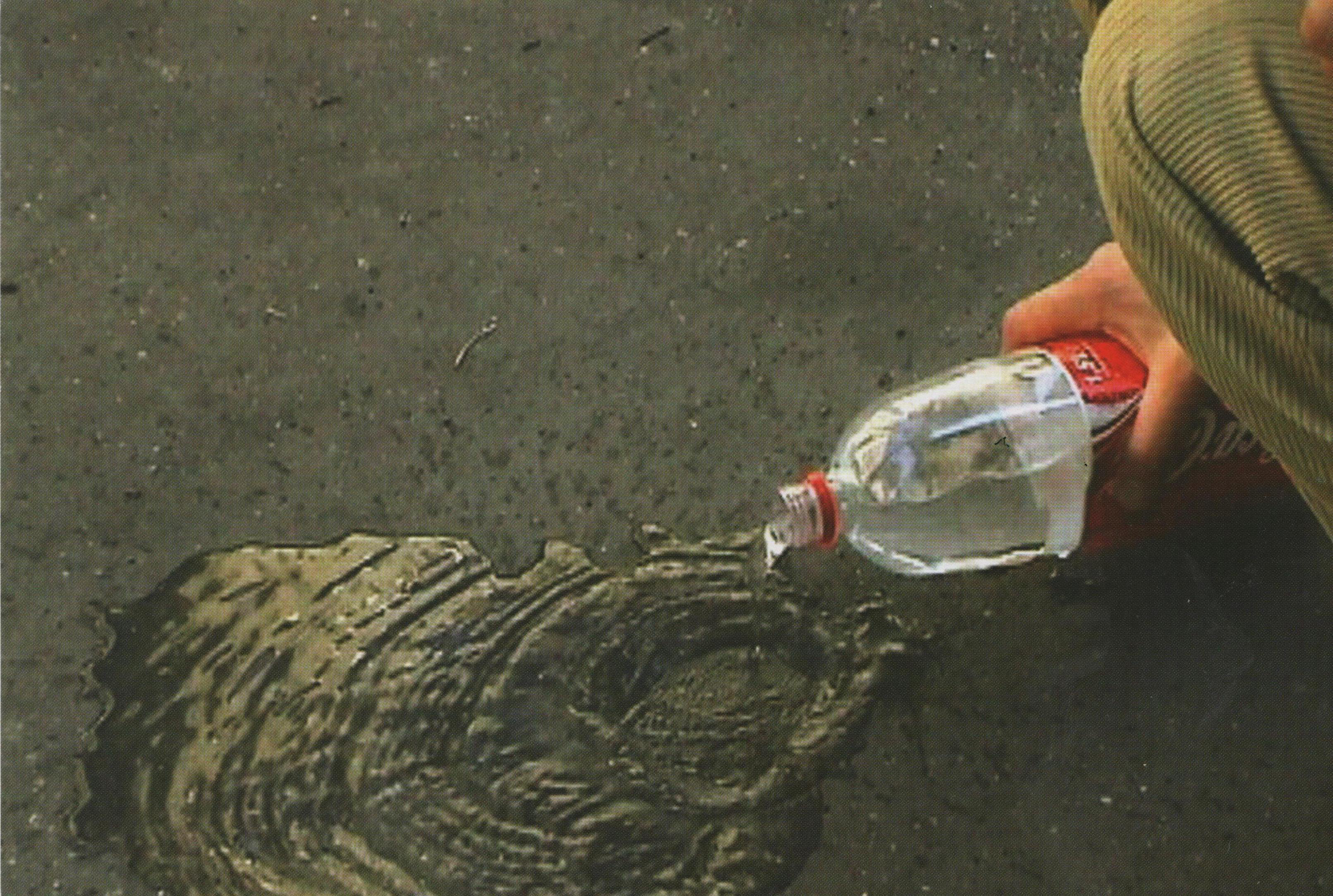 C’est en effet un révélateur que nous voyons ici à l’oeuvre, comme dans une photo qu’on développe. Simon Quéheillard erre dans Paris à la recherche du bitume parfait, rue Villiers de l’Isle-Adam, rue de la Chine, rue Fessart. Avec une bouteille en PVC de Coca d’un rouge bien vulgaire, il verse de l’eau au sol, crée une flaque et y révèle le monde. Parfois l’eau s’écoule, la flaque s’assèche, l’image meurt. Parfois ses flaques épousent le paysage, une flaque longue va, une fois les ridules apaisées, montrer le clocher de l’église voisine.