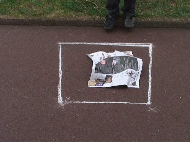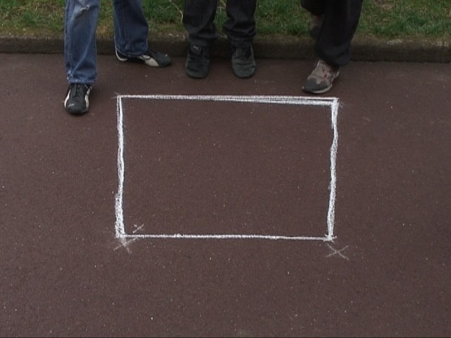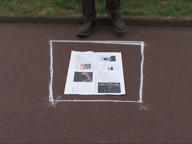 Le Correcteur de perspective est une œuvre de l’artiste hollandais Jan Dibbets, datée de 1968. Nous la reprenons ici dans son principe, en partie modifié. L’expérience débute en traçant au sol une croix à chaque angle du cadre de la caméra. Puis, nous relions les points : au sol, se dessine un trapèze. Tandis qu’à l’écran, un rectangle se dresse sans support. Au-delà de l’explication (sans grande importance) du phénomène observé, comment se fait-il que l’on puisse voir quelque chose « qui n’existe pas » ?