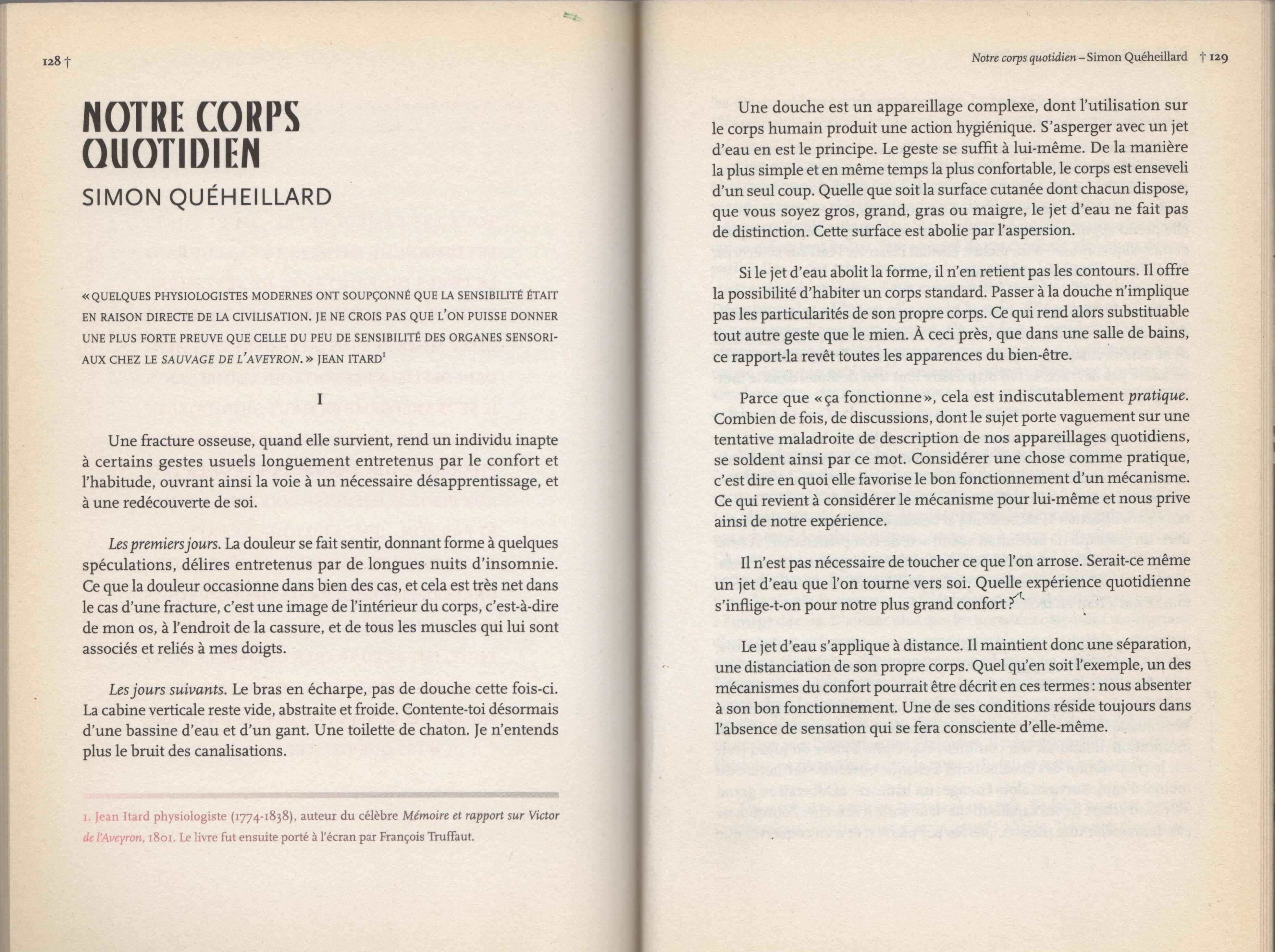 Dans son mémoire sur Victor, l’enfant sauvage l’Aveyron, l’éducateur Jean Itard écrit : « c’est une chose admise pour les physiologistes que les habitants Midi doivent qu’à l’action chaleur sur peau cette sensibilité exquise, supérieure celle des hommes Nord. J’employai stimulus toutes les manières. lui fis donner tous les jours, une très haute température, bain deux trois heures, pendant lequel lui administrait avec même eau des douches fréquentes sur tête ». but l’opération était lui « attendrir chair », diminuer masse musculaire, espérant que cette opération tourne profit sensibilité nerveuse, ainsi rappeler lui certaines sensations qu’ont occultées plusieurs années d’une vie l’état sauvage. Toute période convalescence ouvre voie une nécessaire compréhension. Entrer convalescence : telle pourrait être formule désignant tout acte qui conduit l’éveil des sensations. Nous dirions comme Clézio qu’ « n’y avait pas d’art, que médecine ».