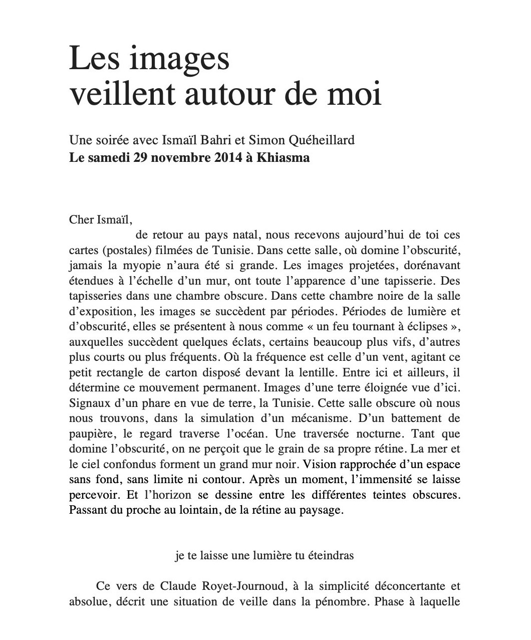 retour pays natal, nous recevons aujourd’hui toi ces “cartes postales” filmées Tunisie. Dans cette salle, domine l’obscurité, jamais myopie n’aura été grande. Les images projetées, dorénavant étendues l’échelle d’un mur, ont toute l’apparence d’une tapisserie. Des tapisseries dans une chambre obscure. Dans cette chambre noire salle d’exposition, les images succèdent par périodes. Périodes lumière d’obscurité, elles présentent nous comme «un feu tournant éclipses», auxquelles succèdent quelques éclats, certains beaucoup plus vifs, d’autres plus courts plus fréquents. fréquence est celle d’un vent, agitant petit rectangle carton disposé devant lentille. Entre ici ailleurs, détermine mouvement permanent. Images d’une terre éloignée vue d’ici. Signaux d’un phare vue terre, Tunisie. Cette salle obscure nous nous trouvons, dans simulation d’un mécanisme. D’un battement paupière, regard traverse l’océan. Une traversée nocturne. Tant que domine l’obscurité, perçoit que grain propre rétine. mer ciel confondus forment grand mur noir. Vision rapprochée d’un espace sans fond, sans limite contour. Après moment, l’immensité laisse percevoir. l’horizon dessine entre les différentes teintes obscures. Passant proche lointain, rétine paysage.