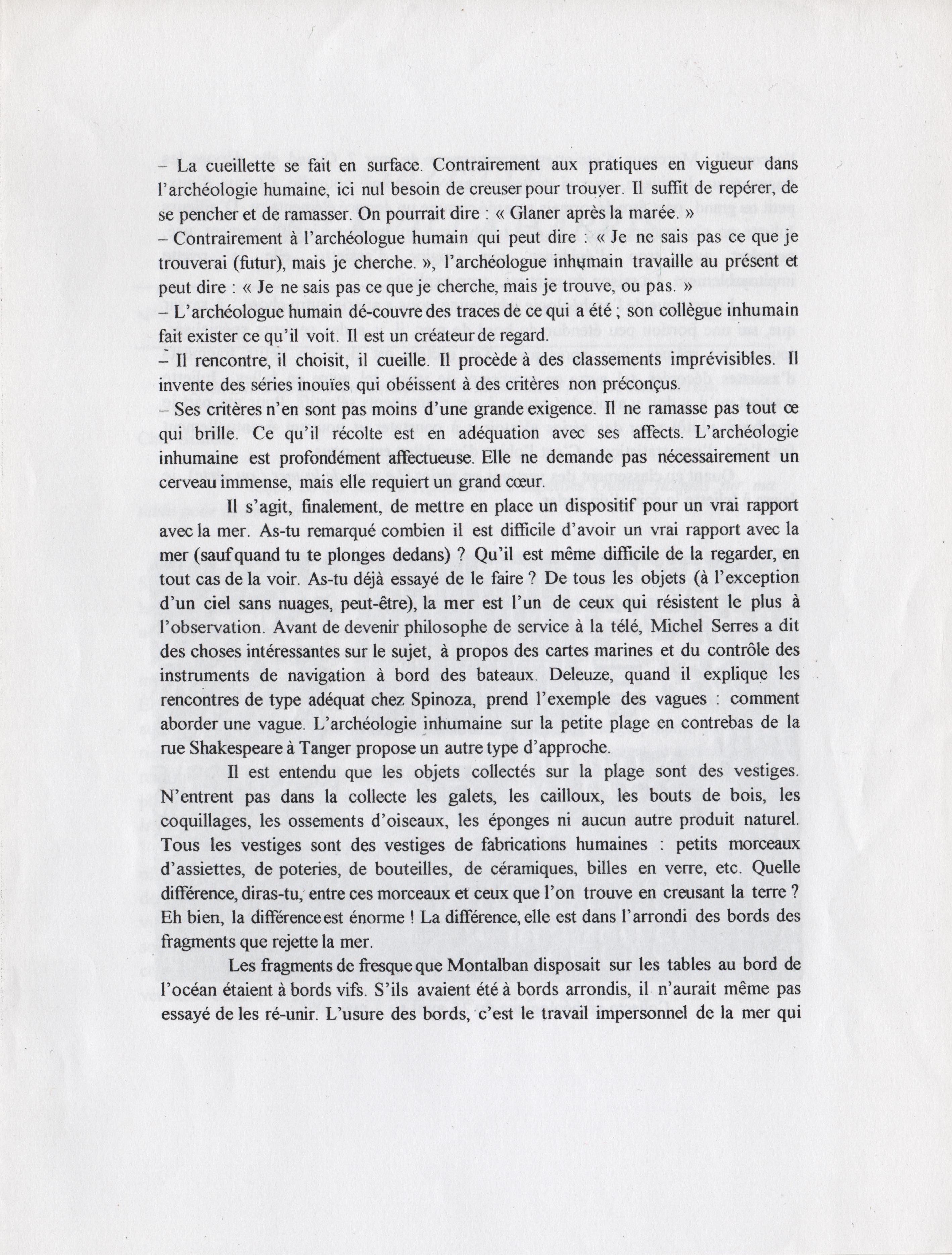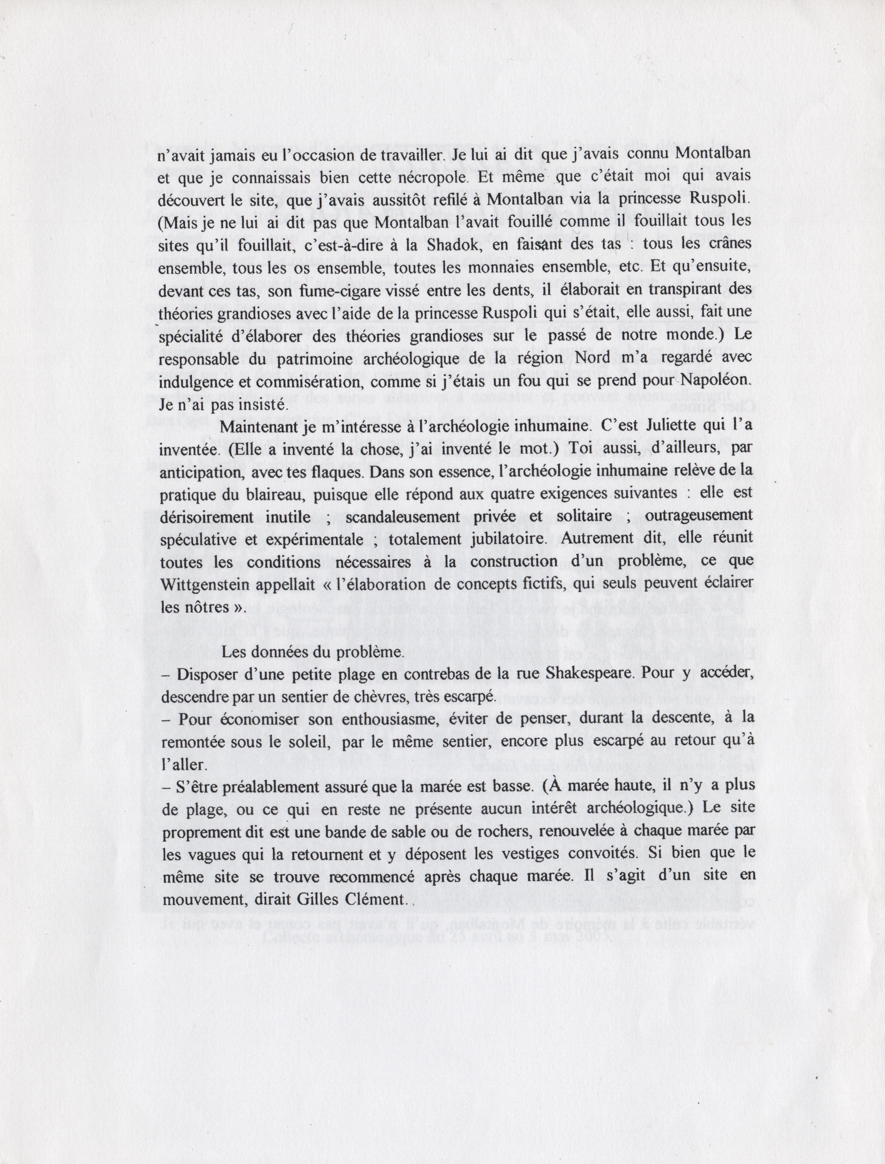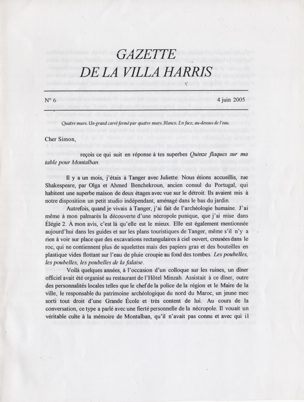 Gazette de la Villa Harris, 2005. Le texte qui suit est une lettre du poète Emmanuel Hocquard en réponse à mon oeuvre photographique « Quinze flaques sur ma table », dédicassée à l’archéologue Montalban, personnage de ses livres.