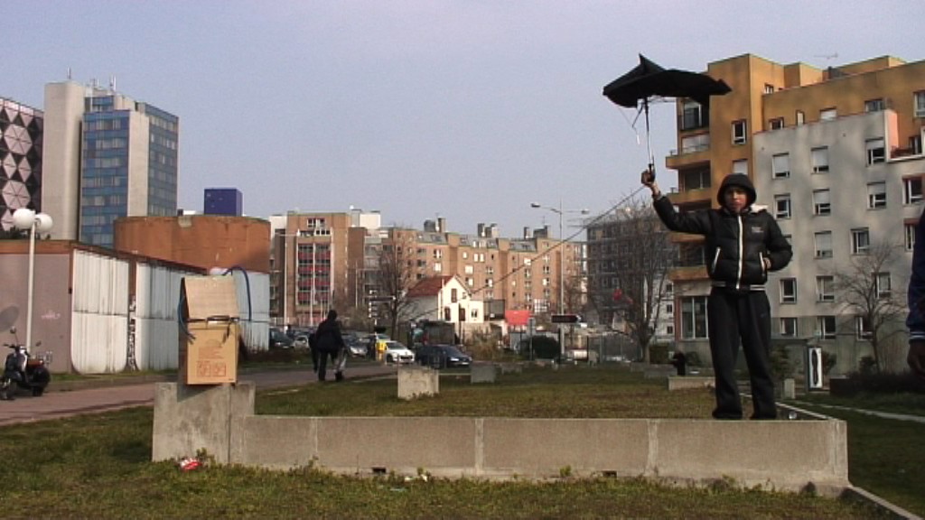 Nous avons élu notre terrain jeux sur les terrasses aux pieds des tours mercuriales, Bagnolet, dix minutes pied collège. Les différents éléments mis jeu lors cet atelier étant l’architecture les infrastructures urbaines, vent, ainsi qu’une collection d’objets hétéroclites tels que des cartons d’emballage, des bouteilles plastique vides rebuts tous genres. des principes l’atelier nous rappelle cette scène quasi-mythique modernité dans une ville, des enfants jouent partir d’objets délaissés sur terrain vague. C’est une scène récurrente dans les films des années soixante. chaque séance, était présenté aux élèves même grand sac rempli d’objets délaissés, tel coffre jouet une boîte outils (ici jeu comme forme primordiale pédagogie). Ces objets dont plus personne veut, personne les vend, personne les achète. Libérés leur dimension utilitaire comme leur fonction, ils déploient espace vacuité travers cette existence gratuite sans but. Cette vacuité demeure pour moi des espaces privilégié l’observation. Objets échoués, emballages perdus dans les décombres, morceaux choses jetés rebus, déchets l’abandon. délaissé (c’est qui reste toujours malgré tout) reste libre (temporairement) toutes conventions. dont n’attend plus rien peut être réinvestit émotionnellement. jeu déploie alors ses propres règles. des principes base burlesque, cette liberté l’égard des objets (et leur fonction) prend source dans geste préalable destruction. Une chose devient autre détruisant. qui signifie une dévalorisation. Petits chiffonniers herbes, ces objets leurs sont d’abord apparus avec réticence. Mais j’observais assez vite leur désinhibition, ainsi qu’un certain désir, notamment pour les sacs plastiques l’enivrement qu’ils procurent circulant dans les courants d’air.