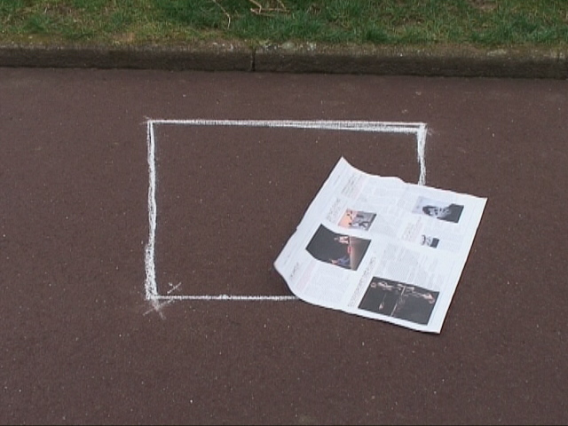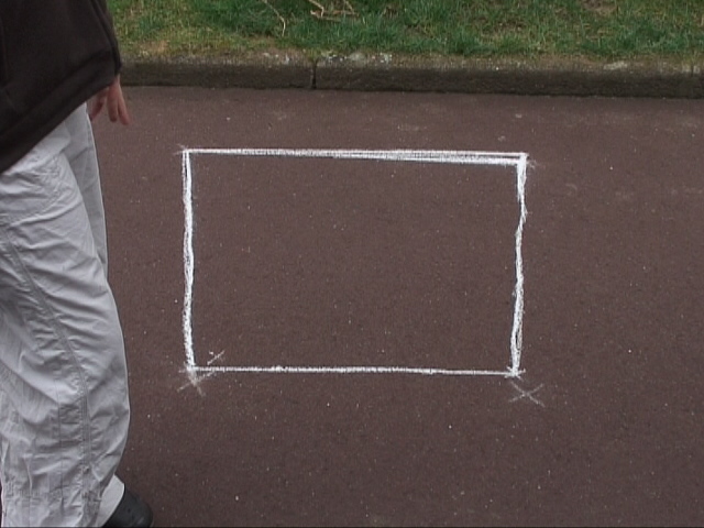 Le Correcteur de perspective est une œuvre de l’artiste hollandais Jan Dibbets, datée de 1968. Nous la reprenons ici dans son principe, en partie modifié. L’expérience débute en traçant au sol une croix à chaque angle du cadre de la caméra. Puis, nous relions les points : au sol, se dessine un trapèze. Tandis qu’à l’écran, un rectangle se dresse sans support. Au-delà de l’explication (sans grande importance) du phénomène observé, comment se fait-il que l’on puisse voir quelque chose « qui n’existe pas » ?